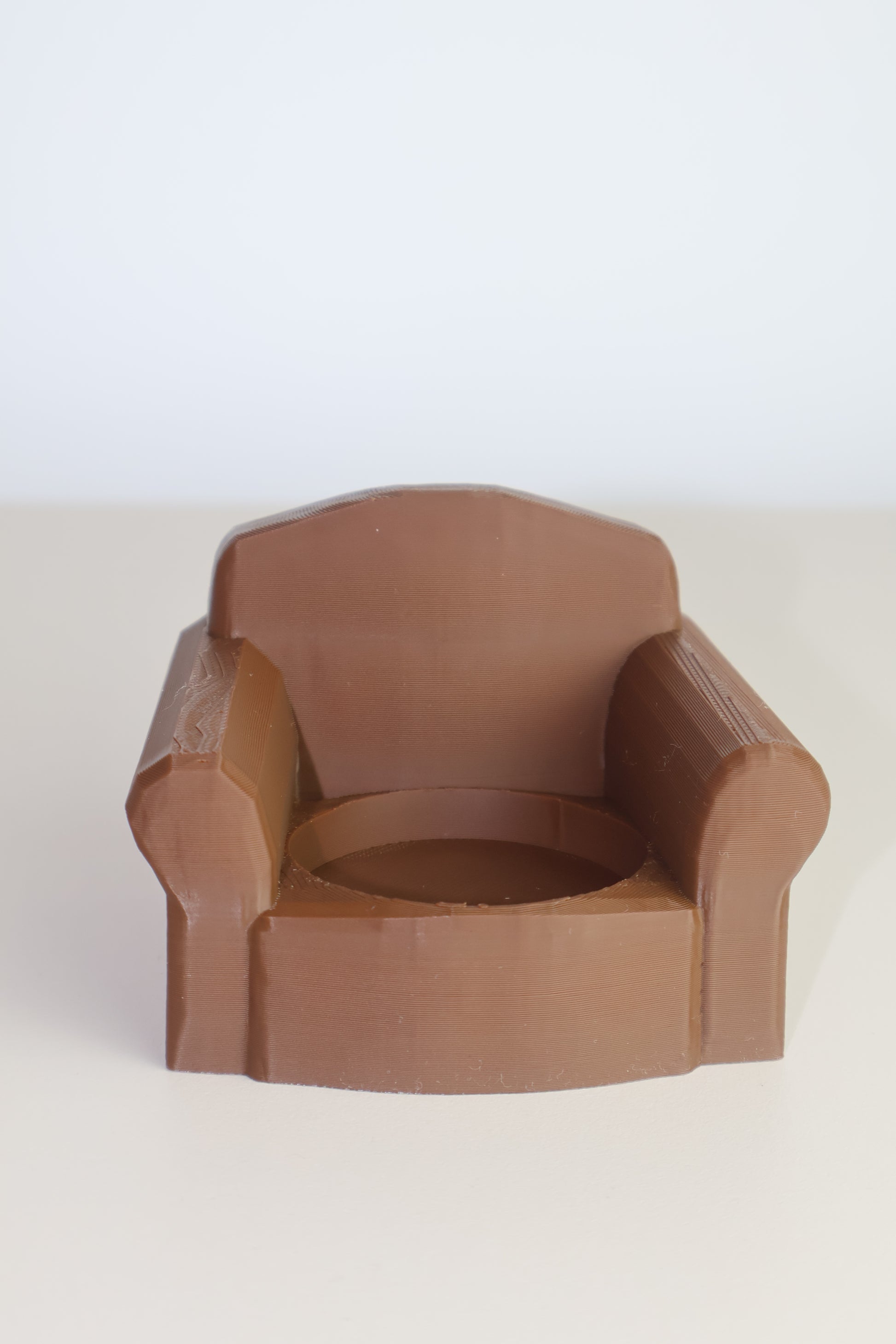 Fotoliul este printat 3D din PLA, un material biodegradabil obținut din resurse regenerabile precum amidonul de porumb. PLA este sigur, durabil și oferă un finisaj curat, ideal pentru obiecte decorative și colecționabile.