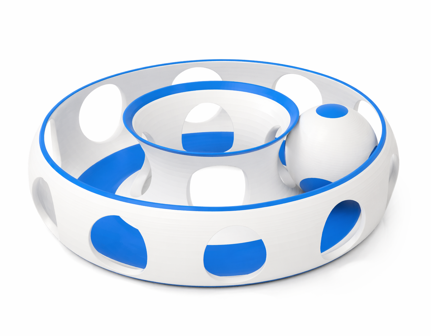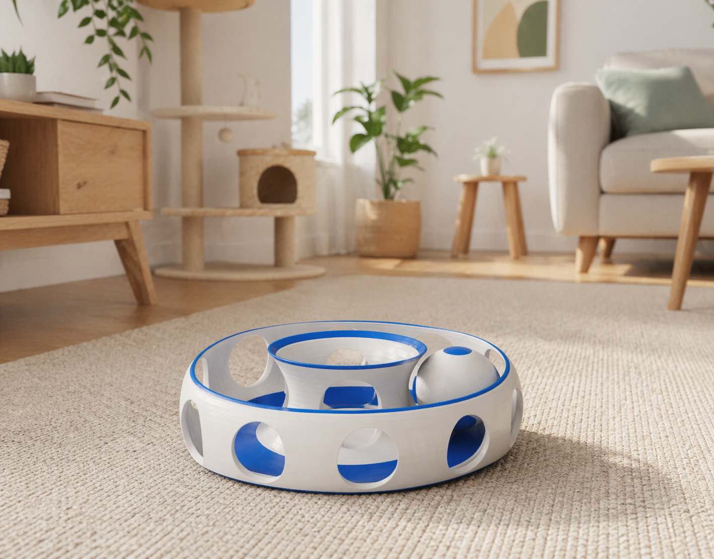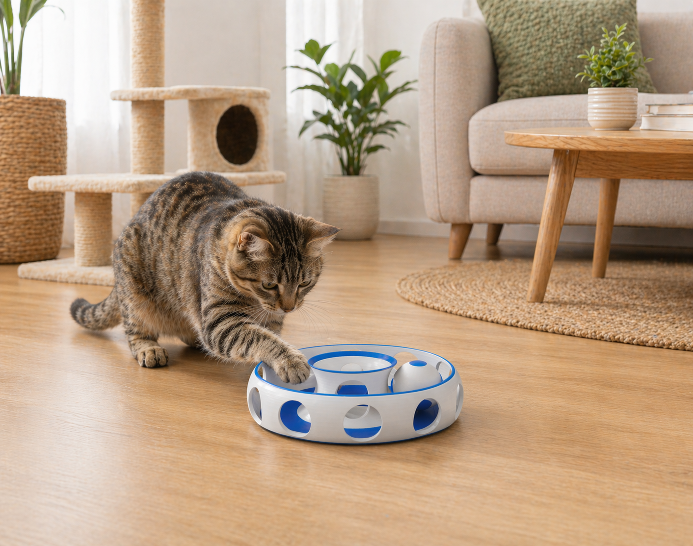 Jucărie simplă și captivantă: un inel cu bilă integrată care se mișcă liber, stimulând instinctul de joacă al pisicii (potrivită și pentru câini de talie mică). Dimensiuni: 17.5 x 17.5 x 5 cm.