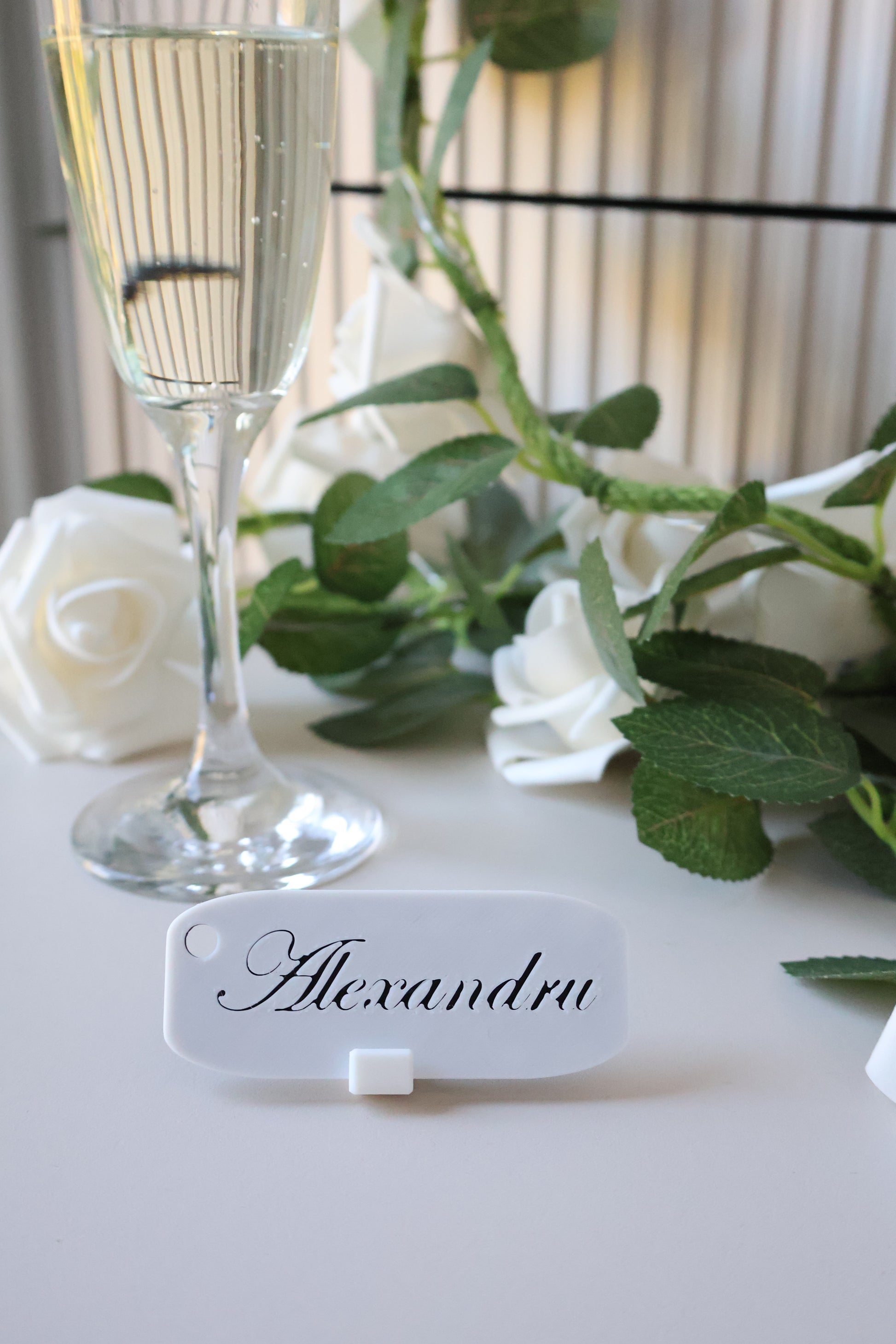 Aceste plăcuțe cu nume pentru masă sunt soluția elegantă și practică pentru organizarea invitaților la evenimente precum nunți, botezuri sau alte ocazii speciale. Se așază direct pe masă și ajută fiecare invitat să își găsească ușor locul, adăugând în același timp un element decorativ personalizat.
